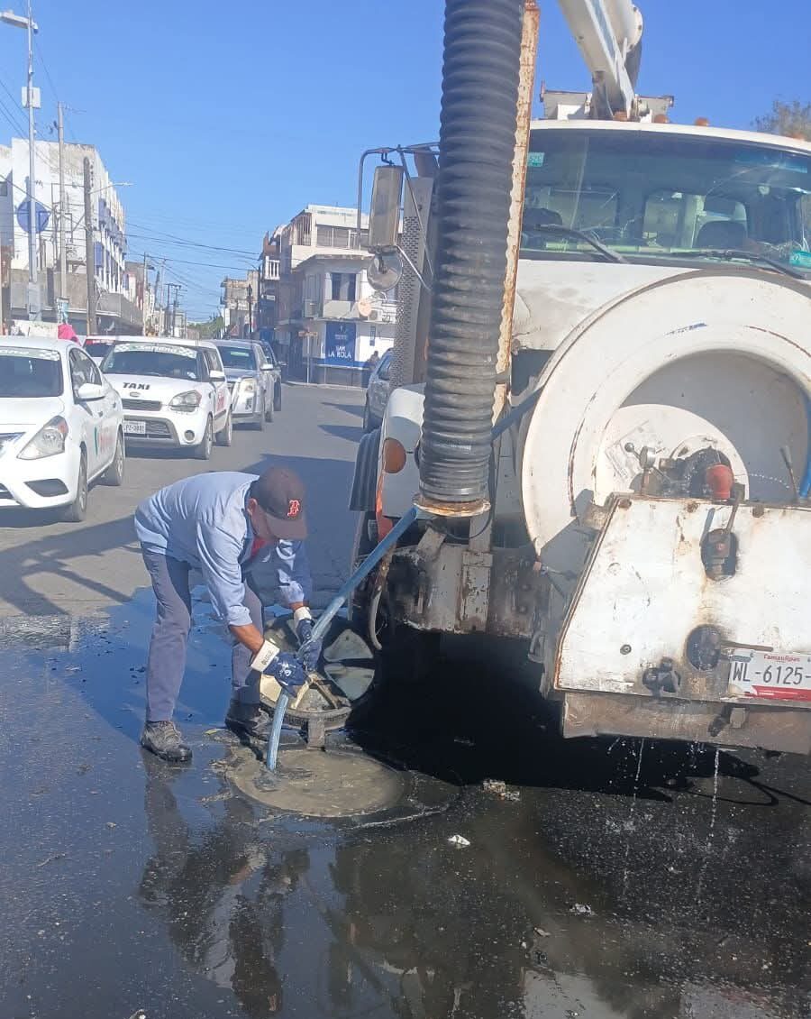 Por instrucciones del alcalde Beto Granados, el camión vactor continúa trabajando en la zona centro de Matamoros; en la calle 11, entre Morelos y González, se realizan labores de limpieza y sondeo en las líneas de drenaje sanitario.