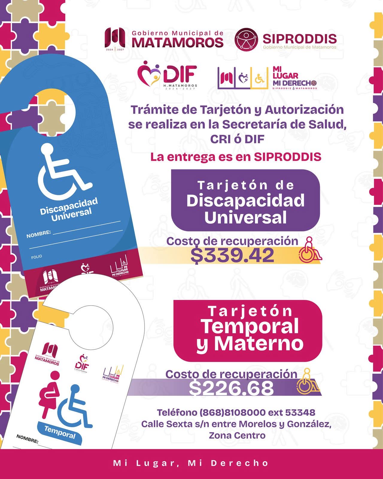 El Gobierno de Beto Granados continúa fortaleciendo el renacimiento de Matamoros con acciones que promueven la igualdad de oportunidades y el acceso pleno a los derechos. A través de la Secretaría de Salud, el CRI y el DIF, se invita a las y los ciudadanos a tramitar su Tarjetón de Discapacidad Universal, Temporal o Materno, un documento que garantiza el derecho a la movilidad y contribuye a una ciudad verdaderamente inclusiva.