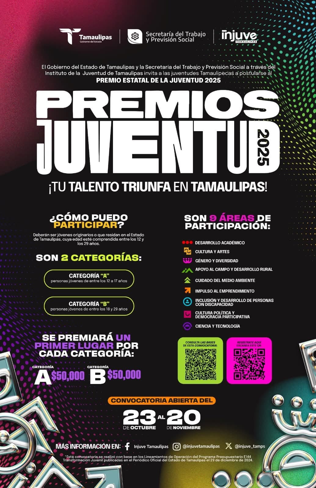 El Gobierno de Beto Granados, comprometido con el impulso y desarrollo de las nuevas generaciones, invita a las y los jóvenes de Matamoros a participar en el Premio Estatal de la Juventud 2025, una convocatoria que reconoce el talento, la creatividad y el esfuerzo de quienes destacan en distintos ámbitos y contribuyen al crecimiento de Tamaulipas.