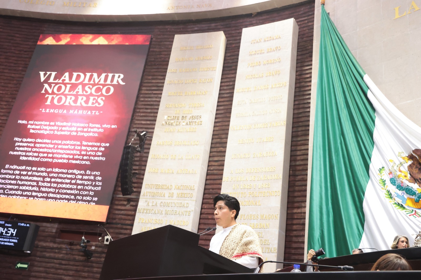 Ante diputadas y diputados, Vladimir Nolasco Torres, hablante de lengua náhuatl, llamó a preservar, aprender y enseñar las lenguas de sus ancestros o antepasados, ya que son una de las raíces que mantienen viva su identidad como pueblo mexicano.