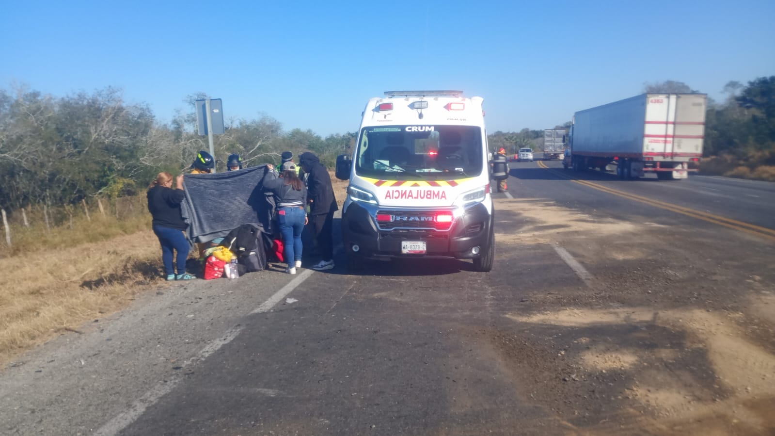 Al sitio acudieron de manera inmediata unidades de Protección Civil de San Fernando, identificadas como la ambulancia A-08 y el camión de bomberos B-06, quienes al arribar localizaron un tráiler con placas 008-WP-5 y un vehículo Nissan March color blanco, con placas XNJ-189-0, involucrados en el percance.